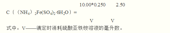 V1——空白試驗(7.4)所消耗的消耗硫酸亞鐵銨標準滴定溶液的體積,mL; V2——試料試驗(7.8)所消耗的消耗硫酸亞鐵銨標準滴定溶液的體積,mL; V0——試料的體積,mL;