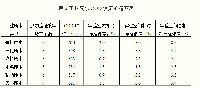 40個不同的實驗室測定COD值為500mg/L的鄰苯二甲酸氫鉀(4.7)標準溶液,其標準偏差為20mg/L,相對標準偏差為4.0%。 8.2.2 工業(yè)廢水測定的精密度(見表2)