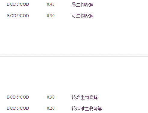 當(dāng)BOD5/COD≥0.45時(shí),不可生物降解的有機(jī)物僅僅占全部有機(jī)物的20%以下,而當(dāng)BOD5/COD≤0.2時(shí),不可生物降解的有機(jī)物已占全部有機(jī)物的60%以上。