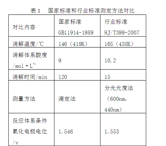 目前*內(nèi)COD分析方法主要依據(jù)于1989年制定的*家標(biāo)準(zhǔn)GB11914-89(簡(jiǎn)稱*家標(biāo)準(zhǔn))[2],該標(biāo)準(zhǔn)是在ISO6060的基礎(chǔ)上,結(jié)合*內(nèi)多家實(shí)驗(yàn)室的驗(yàn)證比對(duì),**終確定的。**近又頒布了環(huán)保行業(yè)標(biāo)準(zhǔn)HJ/T399-2007《水質(zhì) 化學(xué)需氧量的測(cè)定 快速消解 分光光度法》(簡(jiǎn)稱行業(yè)標(biāo)準(zhǔn))[3],該標(biāo)準(zhǔn)方法在《水和廢水監(jiān)測(cè)分析方法(第四版)》[4]的“快速密閉催化消解法(含光度法)”的基礎(chǔ)上,參考?xì)W美和*際相關(guān)研究成果及標(biāo)準(zhǔn),結(jié)合*內(nèi)外發(fā)展?fàn)顩r,在取得大量應(yīng)用經(jīng)驗(yàn)的基礎(chǔ)上,開(kāi)展比較研究及試驗(yàn)驗(yàn)證工作,建立了滿足我*水環(huán)境監(jiān)測(cè)需要的行業(yè)標(biāo)準(zhǔn)監(jiān)測(cè)分析方法?,F(xiàn)就此方法與過(guò)去的*家標(biāo)準(zhǔn)進(jìn)行對(duì)比分析。