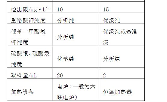 由于化學(xué)需氧量的測(cè)定一個(gè)條件性試驗(yàn),在200℃以下很難保證將大部分有機(jī)化合物消解完全,綜合地說(shuō),對(duì)一般有機(jī)化合物的氧化率能達(dá)到90%以上,但能達(dá)到100%的為數(shù)卻不多(如鄰苯二甲酸氫鉀)?,F(xiàn)將*家標(biāo)準(zhǔn)和行業(yè)標(biāo)準(zhǔn)的測(cè)定條件進(jìn)行對(duì)比,如表1所示。
