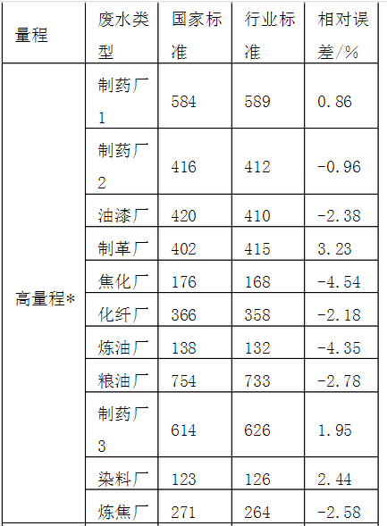 河北省環(huán)境監(jiān)測(cè)中心站曾分別采用*標(biāo)法和行標(biāo)法對(duì)不同類(lèi)型的廢水水樣分低量程和高量程進(jìn)行了對(duì)照實(shí)驗(yàn),數(shù)據(jù)如表2所示[5]。