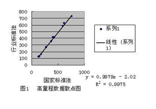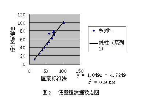我們將*標(biāo)法和行標(biāo)法的高量程和低量程的對(duì)照數(shù)據(jù)分別制成散點(diǎn)圖,如圖1和圖2所示,同時(shí)對(duì)散點(diǎn)圖進(jìn)行線性處理,其相關(guān)系數(shù)R2分別為0.9975和0.9338,即R值分別為0.9987和0.9663,對(duì)于自由度分別為10和12的高量程和低量程的數(shù)據(jù),相關(guān)系數(shù)R的臨界值分別為0.5760和0.5234(α=0.05),說(shuō)明兩者線性相關(guān)關(guān)系是比較好的。在線性方程Yi = aXi+b中,高量程和低量程的系數(shù)a分別為0.9979和1.049,也說(shuō)明兩組數(shù)據(jù)(Xi和Yi)是比較接近的。