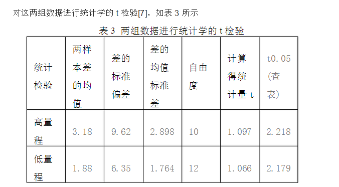 由t檢驗(yàn)可以看出,高量程數(shù)據(jù)的統(tǒng)計(jì)量t=1.10<2.218 =t0.05(10),低量程數(shù)據(jù)的統(tǒng)計(jì)量t=1.07<2.179 =t0.05(12),證明兩種量程的兩組數(shù)據(jù)無(wú)顯著性差異。