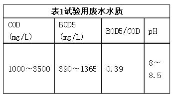 試驗用廢水采用某化工廠排出的綜合廢水,該廢水含有季銨鹽、異丙醇等有機物,日排放量約為20 m3,COD為18 000~25 000 mg/L,BOD5為7 020~9 750 mg/L,BOD5/COD為0.39左右,屬于可生化真溶液廢水。由于該廢水有機物濃度高,將其適當(dāng)稀釋后作為試驗用水,其水質(zhì)見表1。