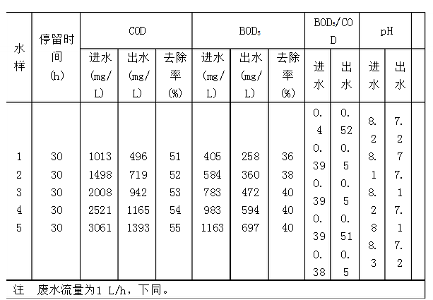 馴化掛膜穩(wěn)定后,在所設(shè)定的工況條件下開始試驗運行,定期取樣分析。處理結(jié)果見表2。