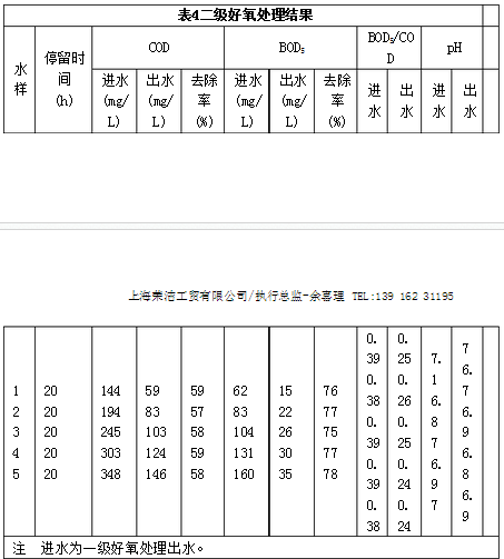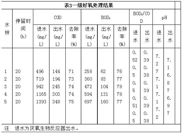 2.2 好氧生物接觸氧化處理 好氧接觸氧化法具有耐沖擊負(fù)荷,無污泥膨脹和維護方便等優(yōu)點。采用一級好氧生物接觸氧化處理,出水中的COD仍然達不到排放標(biāo)準(zhǔn),后又增加了一級好氧生物接觸氧化處理(有效容積20 L)。試驗結(jié)果見表3和表4。