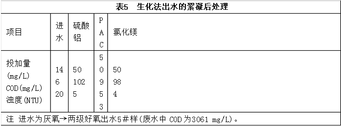 含季銨鹽廢水中COD為2 000~3 000 mg/L,經(jīng)過厭氧→兩級好氧生物接觸氧化處理后,出水COD>100 mg/L,且略有余濁,故進行絮凝后處理。分別采用硫酸鋁、聚合鋁(PAC)和氯化鎂為絮凝劑,石灰為助凝劑,試驗結(jié)果見表5。