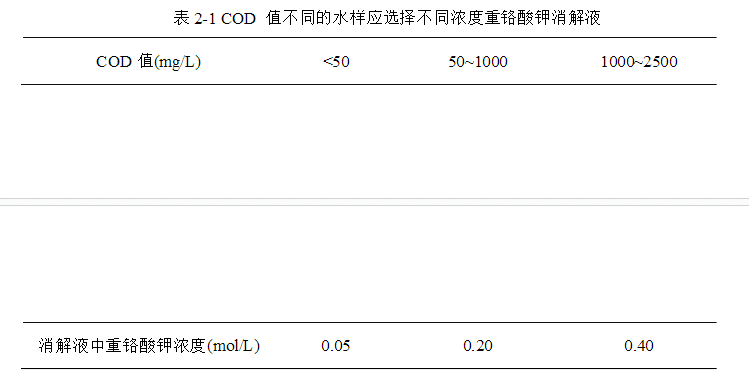 測定地表水、工業(yè)廢水(包括高鹽廢水)、生活污水的化學需氧量。根據(jù)水樣化學需氧量值得的不同,在消解時應選擇不同濃度的重鉻酸鉀消解液進行消解。參考表2-1選擇消解液。