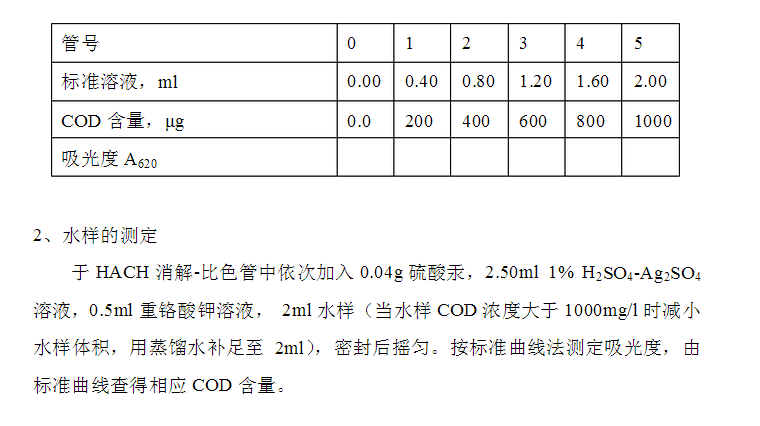 原理:用一定量的重鉻酸鉀在強酸性溶液中,加入硫酸汞去除氯離子干擾,在銀催化下,經(jīng)過高溫消解反應(yīng)后的溶液COD濃度與吸光度成線性關(guān)系,符合朗伯—比爾定律,在620nm處比色得出樣品濃度。