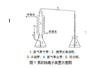 子轉(zhuǎn)化為氨氣,通過氮氣的吹送,將溶液中的氨氣導(dǎo)入硼酸溶液吸收。樣品瓶上端安裝循環(huán)冷卻水裝置,防止部分低沸點有機物揮發(fā)。