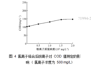 變,COD 明顯增加。因此,當水樣中存在氯離子時,銨離子可對 COD 的測定產(chǎn)生正干擾。