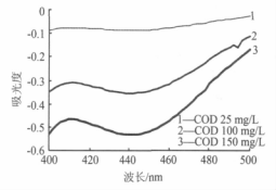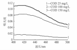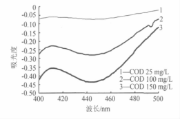 由圖 1 可知,在400~500 nm 波長范圍內,對應于水樣 COD 從 25 mg/L 變到 100 mg/L,重鉻酸鉀氧化所產生的 Cr(Ⅲ)的吸光度變化**大只有 0.06 多