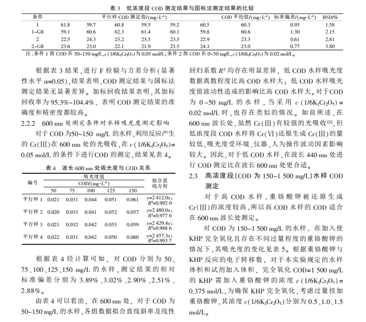 2008 年*家環(huán)境保護總局發(fā)布了《水質 化學需氧量的測定 快速消解分光光度法》,將 15~1 000 mg/L 的 COD 劃分為 2 個濃度段, 雖然每個濃度段 COD