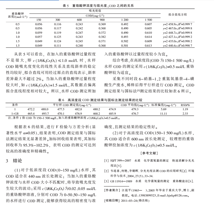 7 )=0.02 mol/L,COD 為 10~50 mg/L 時, 水樣 COD 與吸光度