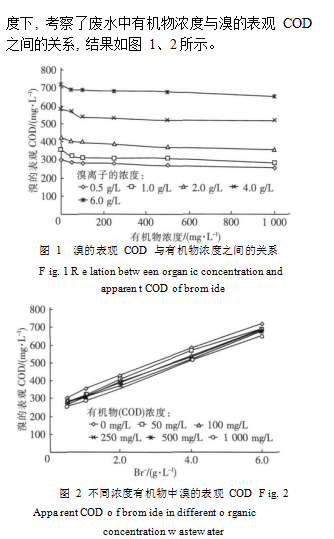 為了進一步探索溴的表觀 COD 與有機物濃度之間的關(guān)系, 在不同的溴離子濃度和不同有機物濃 |