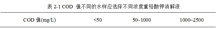測定地表水、工業(yè)廢水(包括高鹽廢水)、生活污水的化學(xué)需氧量。根據(jù)水樣化學(xué)需氧量值得的不同,在消解時應(yīng)選擇不同濃度的重鉻酸鉀消解液進(jìn)行消解。參考表2-1選擇消解液。