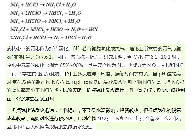 折點(diǎn)氯化法(Break Point Chlotination)是將氯氣通入廢水中達(dá)到某一點(diǎn),在該點(diǎn)時水中游離氯含量較低,而氨的濃度趨于零。當(dāng)氯氣通入量超過該點(diǎn)時,水中的游離氯就會增多。多余的氯氣與水反應(yīng)生成次氯酸,次氯酸與氨氣反應(yīng)生成無害的氮?dú)猓浞磻?yīng)式如下