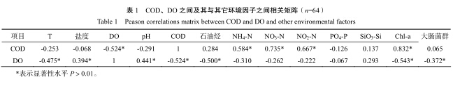 海水中 DO 的主要來源是大氣中氧的溶解,其次來自于海洋生物,尤其是浮游植物光合作用時所放出的氧。表 1 中,DO 值主要與溫度、pH、COD、石油烴、Chl-a、大腸菌群、鹽度等指標顯著相關,相關系數(shù)分別為-0.475、0.441、-0.524、-0.5、-0.543、-0.372、0.394。DO 與溫度明顯負相關, 符合水體中溶解氧與溫度分布呈反比例的一般規(guī)律(見表 1) 。DO 與 pH 顯著正相關,則反映了有機污染物氧化分解,消耗氧氣,并導致 pH 值下降的過程。DO 與石油烴明顯負相關,可能與石油烴降解耗氧及石油烴污染易在水面形成油膜,影響水-氣界面氧氣交換的作用有關。盡管亞熱帶河口海區(qū)由于受溫度、光照、及高營養(yǎng)鹽含量等因素影響,往往具有較高的初級生產(chǎn)力(高 Chl-a值) ,浮游植物在光合作用中釋放出大量氧氣,但營養(yǎng)鹽水平較高的海區(qū),其耗氧污染物負荷也較高,污染物降解耗氧速度遠大于生物作用生成氧氣的速度, 這也是 DO 與 Chl-a 呈現(xiàn)負相關的主要原因。大腸菌群指標常用來表征微生物降解有機物能力,有機污染程度越高,大腸菌群則越高,這也解釋了 DO 與大腸菌群顯著負相關的主要原因 [21] 。DO 與鹽度顯著正相關,主要為鹽度越高,則越靠近外海,其污染負荷越小,而 DO 含量則越高。