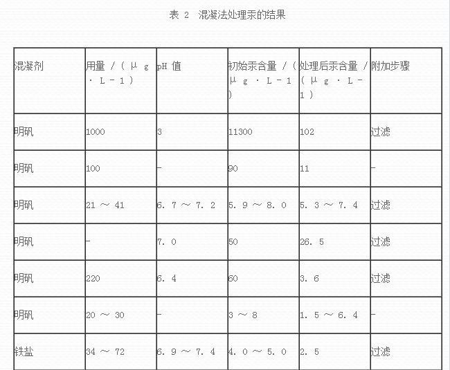 用混凝法對多種廢水進(jìn)行脫汞處理 ,所用的混凝劑包括硫酸鋁 明礬 、鐵鹽及石灰。在混凝法除汞的研究中 ,先在生活污水中加入 50~60 μg/L的無機(jī)汞 ,然后用鐵鹽或明礬聚集并過濾,兩種方法都可使含汞量降低 94% ~98%。用石灰混凝劑處理500 μg/L的高濃度含汞廢水 ,過濾后汞的去除率為70%。某工廠中試比較了明礬和鐵鹽對無機(jī)汞和甲基汞的處理效果 ,結(jié)果表明鐵鹽能有效地除去汞。另一項研究結(jié)果也報道了類似的結(jié)果 ,此外還發(fā)現(xiàn)即使混凝劑用量增加到 100~150mg/L,也不能改善汞的去除效果。表 2列出了混凝法的處理數(shù)據(jù)。明礬處理后汞的出水含量為 1. 5~102 μg/L,鐵鹽處理后則為 0. 5~12. 8 μg/L。但當(dāng)初始汞濃度較低時 ,明礬和鐵鹽的混凝處理效果相似 ,此時汞的出水含量較低 ,為 0. 5~5. 0 μg/L。