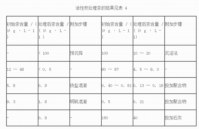從表4數(shù)據(jù)可見,活性炭對高濃度含汞廢水具有較高的去除率 (85%~99%) ;對低濃度汞的去除率雖然并不高,但出水中汞含量**低。因此,活性炭處理初始汞含量小于 1μg/L的廢水,去除率雖然低于70%,但出水汞含量卻可達(dá)0. 25μg/L以下。而同樣處理初始汞含量為10~100μ g/L的廢水,汞去除率雖達(dá)90%以上,但出水汞含量**高達(dá)到 20μg/L。有證據(jù)表明當(dāng) pH值降** 2~4時,汞去除率將有所升高。另一項研究中也觀察到這種 pH效應(yīng),在含汞 10 g/L的廢水中加入 100mg/L的粉狀活性炭,當(dāng) pH值從 9降為 7時,去除率從 50%升** 80%。在其他研究中,人們還選擇了其他物質(zhì)作為吸附劑,,采用 40%AlCl 3溶液改性過的膨潤土在 pH值為 8~9下處理含汞廢水,出水汞含量0. 0351mg/L。于瑞蓮 采用硫酸對天然膨潤土改性后處理含汞廢水,pH值為 8條件下,去除率達(dá)到 97. 1%。研究了 TiO2 復(fù)合吸收劑對含汞廢水的處理,可將汞含量 100μg/L的水樣中汞離子達(dá)到97. 7%的去除率,吸附劑經(jīng)再生后可以再利用。