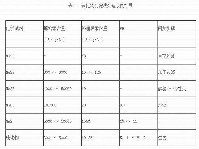含汞廢水中加入硫化鈉處理 ,由于Hg與S有強(qiáng)烈的親和力 ,能生成溶度積小的硫化汞而從溶液中除去。所以硫化物沉淀法是**常用的一種沉淀處理法。沉淀法可與絮凝、重力沉降、過濾或溶氣浮選等分離過程相結(jié)合。這些后續(xù)操作可增加硫化汞沉淀的去除效果 ,但不能提高溶解汞本身的沉淀效率。表1列出了硫化汞沉淀法的各種數(shù)據(jù)。