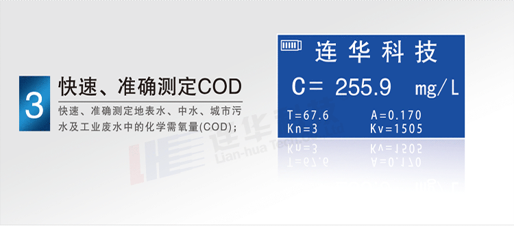 (01) 能準(zhǔn)確測(cè)定地表水、中水、城市污水、工業(yè)廢水中化學(xué)需氧量(COD),濃度直讀;
